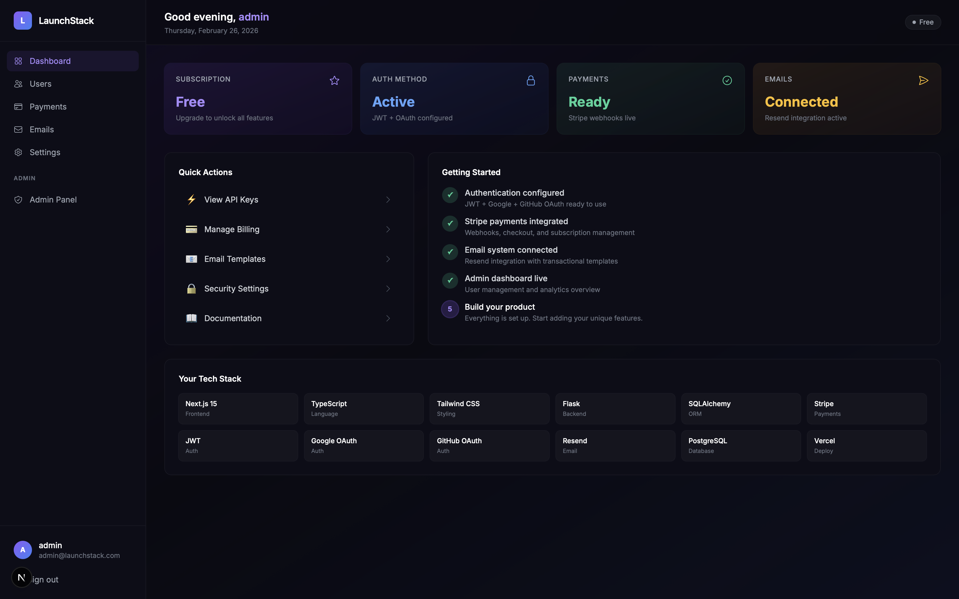 LaunchStack is a production-ready Next.js + Flask codebase with auth, Stripe, email, and admin already built.